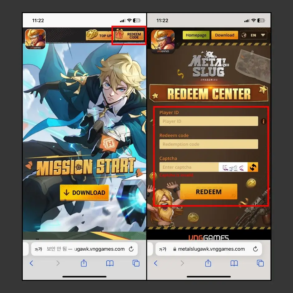 메탈슬러그 각성 쿠폰 입력 방법은 인게임에서 쿠폰을 입력할 수 있는 서비스를 지원하고 있지 않습니다. 따라서 쿠폰 입력은 메탈슬러그 각성 리딤코드 사이트에 접속한 다음 플레이어 아이디(Player ID), 쿠폰 번호(리딤코드), 캡차(Captcha)를 입력해서 쿠폰을 입력할 수 있습니다.