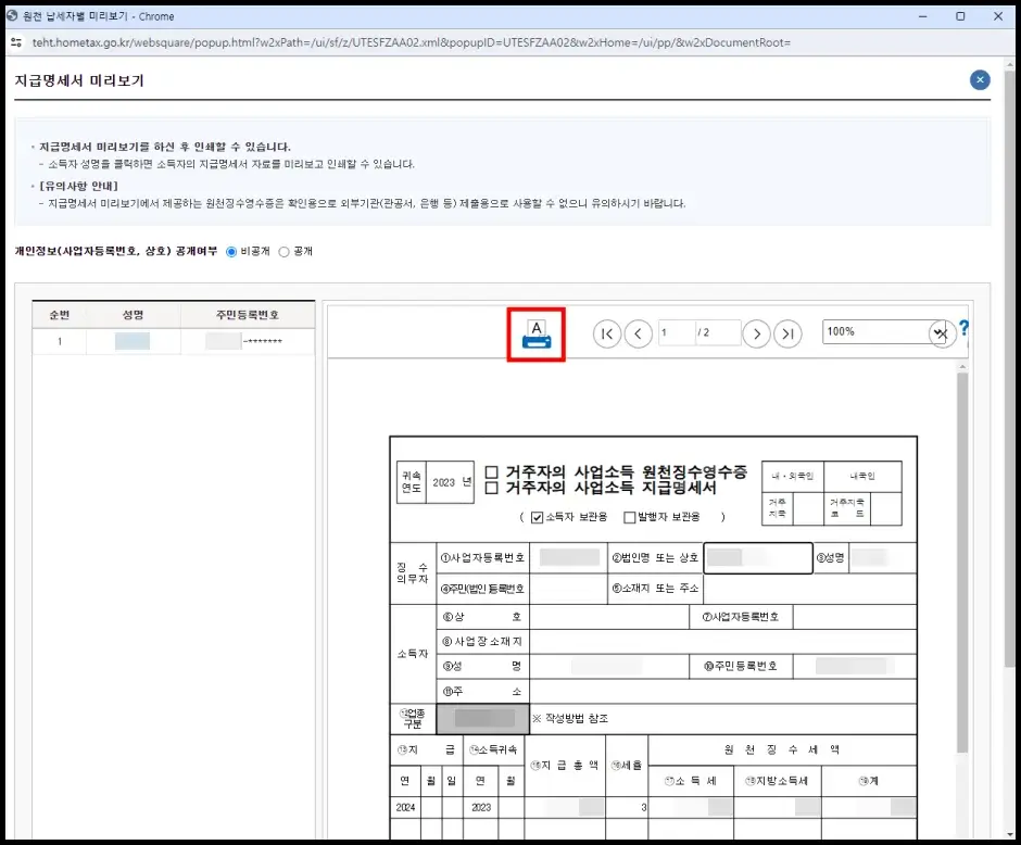 6. ‘원천 납세자별 미리 보기’ 팝업창이 실행되면, 원천징수영수증 미리 보기를 할 수 있습니다.