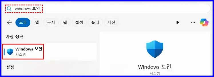 2. 검색창에 ‘windows 보안’을 입력하고, 검색 결과에 “Windows 보안(시스템)” 항목을 클릭해서 실행합니다.